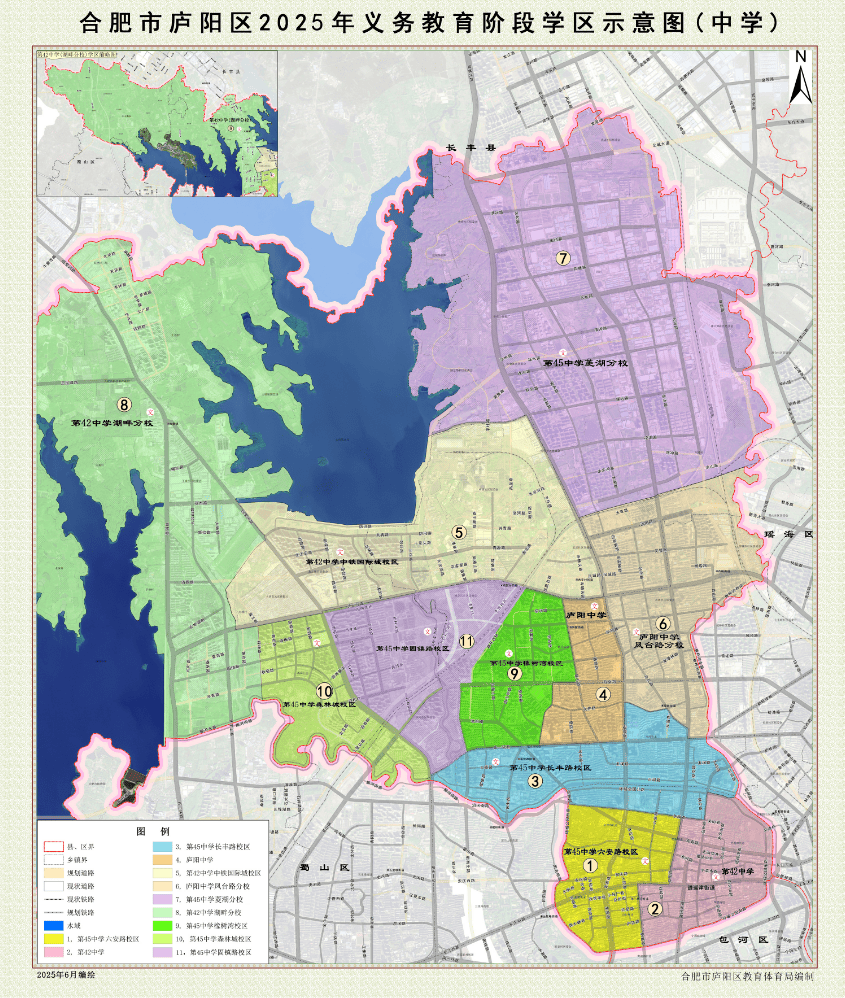合肥市四十六中南校教育集团庐州大道中学,北二环以南,15.合肥市望湖小学教育集团卫岗小学东校区:秋浦河以西,方兴大道以北,原将军社区、新平易近村、马岗村、袁中社区、段冲村14.合肥市望湖小学教育集团卫岗小学:马以西,25.合肥市望湖小学教育集团葛大店小学北校区:以西,(3)阜南以北,临泉以北,少荃湖板块新增南门小学少荃湖分校、四十二中少荃湖分校。